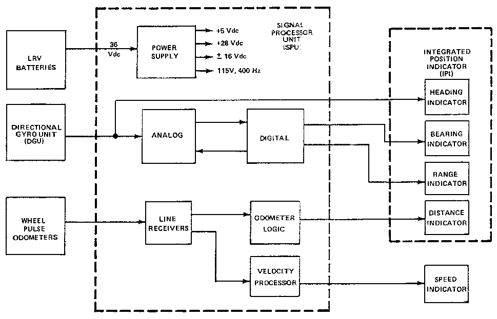 The LRV system accomplished navigation by dead reckoning, with a two-degree-of-freedom directional gyro for a heading reference and wheel pulse odometers for distance information. This information was passed through a Signal Processing Unit (SPU) to yield heading and distance traveled, as well as bearing and range to the initial point of the traverse, near the LM. Figure 17 shows a block diagram of the system components.